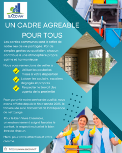 Pour garantir notre service de qualité, nous avons affiché depuis la fin d’année 2025, le tableau de suivi trimestriel de la fréquence de nettoyage.